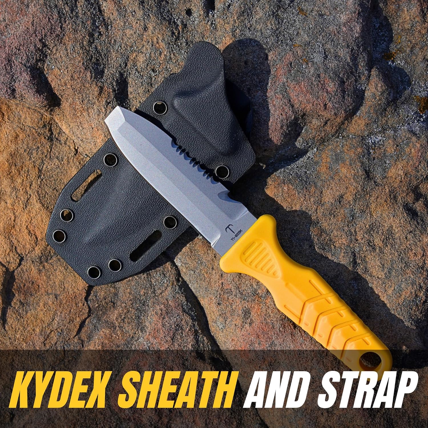 TI GEEK Titanium Survival Scuba Diving Fixed Blade Knife w Sheath & Straps - Holster on Divers BCD, Thigh/Leg, GC Belt Buckle or Wrist, Cutting, Serrated Edge & Line Cutter (Yellow Blunt Tip)